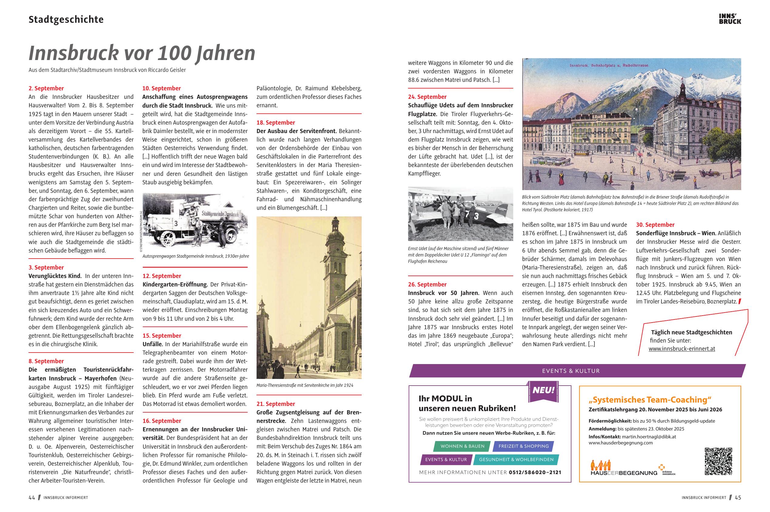 nach Innsbruck und zurück führen. Rückflug Innsbruck – Wien am 5. und 7. Oktober 1925. Innsbruck ab 9.45, Wien an